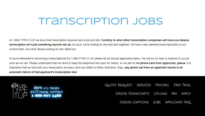 1888typeitup has a bit of a different approach when it comes to transcription jobs. You will be working as an independent contractor and you can choose your hours.