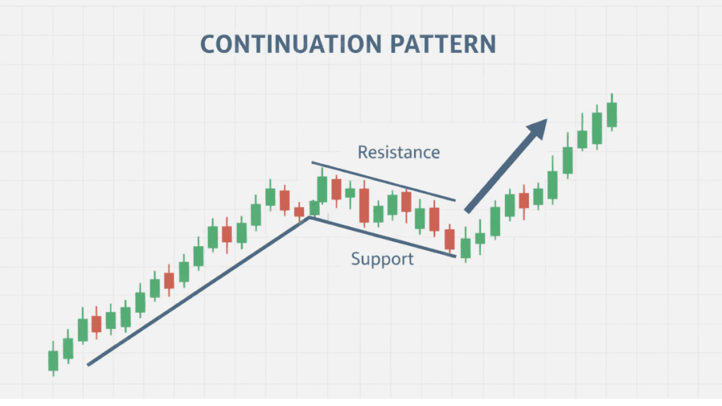 These patterns appear after a strong price move and reflect a period of balance between buyers and sellers. Instead of indicating exhaustion, a continuation pattern usually suggests that the market is catching its breath before continuing in the same direction.