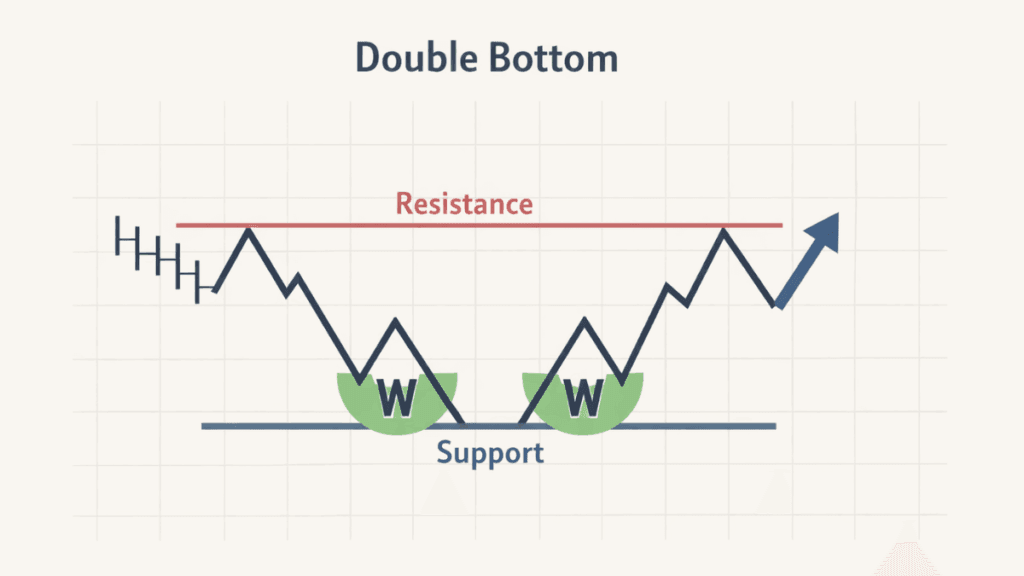 Understanding the psychology behind a Double Bottom helps explain why the pattern works in real markets. After a prolonged decline, sellers are confident and continue to push prices lower until buying interest emerges.