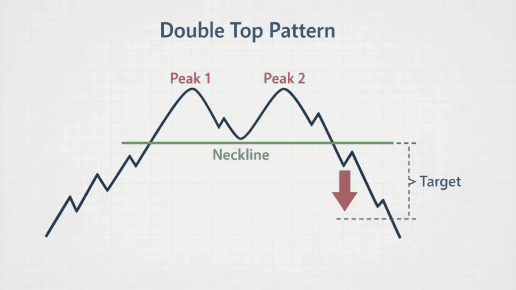 A Double Top pattern is a bearish reversal formation that appears after a sustained upward price move. It is characterized by two peaks at roughly the same price level, separated by a temporary decline.