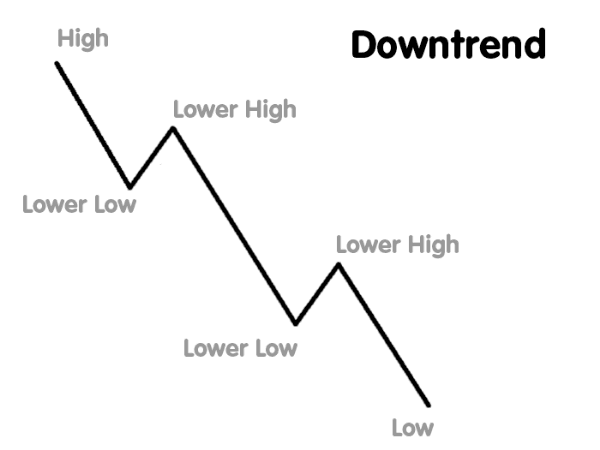 - On a price chart, this manifests as peaks (highs) that keep dropping and troughs (lows) that keep dropping.