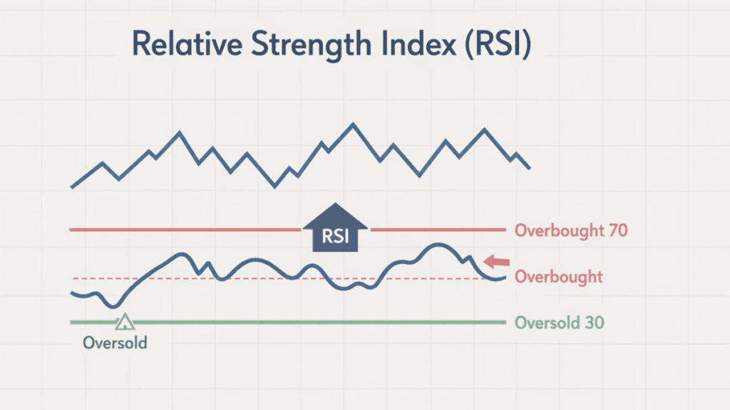 The Relative Strength Index is a momentum oscillator that moves between 0 and 100. Its purpose is to show whether buying or selling pressure is dominating the market at a given time.